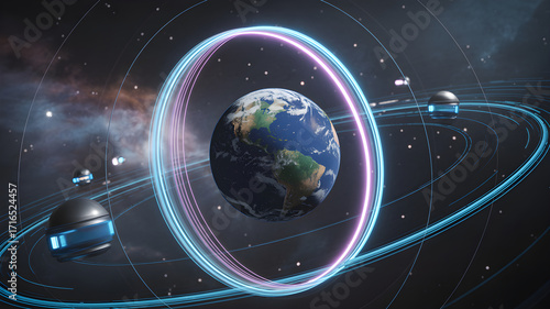 © Sergej, Obraz premium Earth surrounded by data network rings in space
