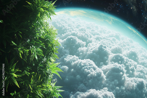© Olegarx525, Obraz premium Earth surrounded by lush greenery and clouds in a vibrant, environmental representation