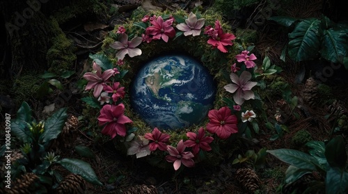 © Thanawat_Suesoypan, Obraz premium Earth surrounded by vibrant flowers in a lush forest setting