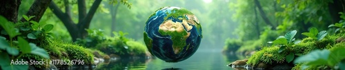 Fototapeta premium Earth suspended in air with lush foliage and water features, green, tranquility