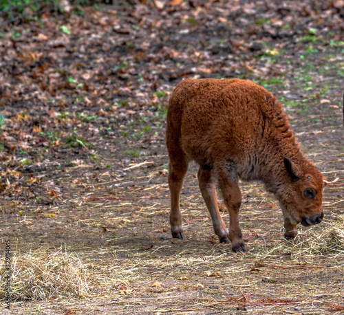 © dan, Fototapeta premium Earth Toned Fur on a Bison Calf Foraging