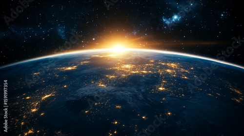Obraz premium Earth View From Space at Sunrise with City Lights and Stars