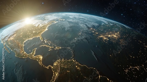 © Maftuh, Obraz premium Earth View From Space with City Lights and Sun