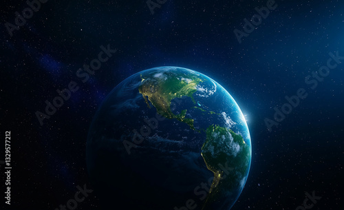 © Premium, Obraz premium Earth viewed from space, showcasing North and South America illuminated by sunlight, surrounded by starry background, evokes sense of wonder and beauty