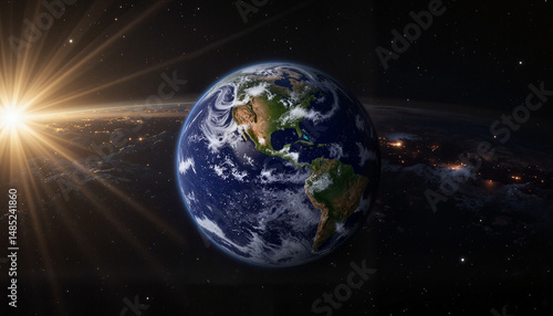 Fototapeta premium Earth viewed from space with sunray illuminating the surface