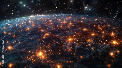 © Jiraporn, Naklejka premium Earth with glowing network representing digital technology concept. Aerial view of a connected world illuminated by bright lights.