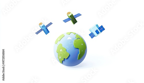 © IQRAM, Fototapeta premium Earth with orbiting satellites. Multiple satellites, various colors, orbit a 3D model of Earth