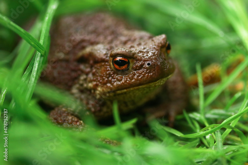 © Natalya, Fototapeta premium Earthen brown toad in green grass in rainy weather close up partial focus