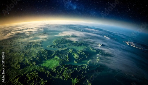 Fototapeta premium Earthrise: Coastal Dawn, Green Isles & Starry Sky