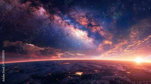 © paper later, Fototapeta premium Earthrise with Milky Way and City Lights