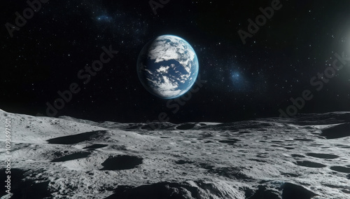 Obraz premium Earths distant view from the rocky surface of the moon in space.