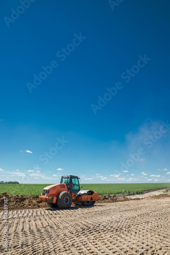 Obraz premium Earthwork during road construction. Orange tractor - Vibrating Roller.