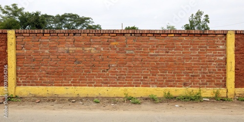 Fototapeta premium Earthy red brick wall with yellowish mortar, rustic pattern, earthy tones