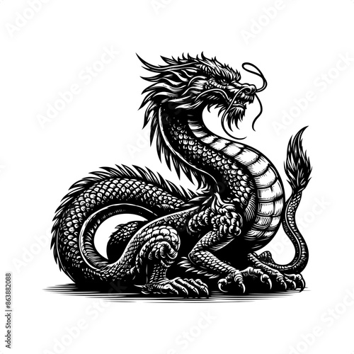 © Orion Draw, Obraz premium east dragon in black and white animal illustration
