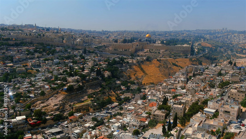 Fototapeta premium East jerusalem old city and arab neighborhood, aerial Beautiful drone shot from Old city of Jerusalem al Aqsa Mosque, June, 2022, israel