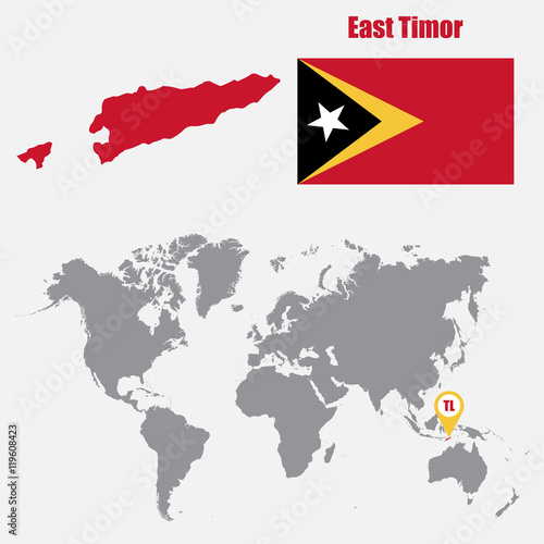 © stas111, Obraz premium East Timor map on a world map with flag and map pointer. Vector illustration