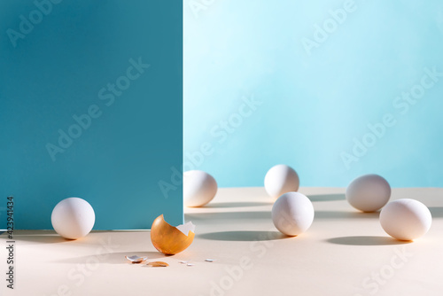Fototapeta premium Easter background. White eggs with golden shell on a blue background