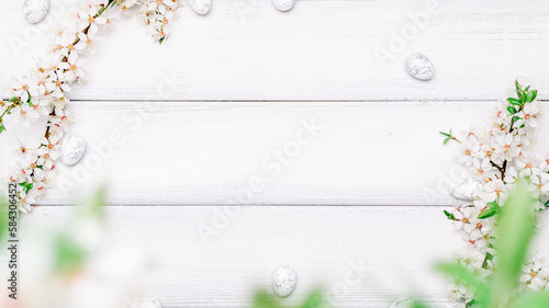 Fototapeta premium Easter background wood. Sakura blossom flower, white happy easter eggs on wood spring background. Easter design. Top view. Flat lay.