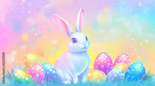 © Zohra, Obraz premium Easter banner and poster template with Easter eggs and a rabbit in a metallic holographic gradient style.Easter Day greetings and gifts.Easter shopping and promotion template
