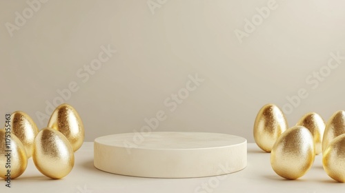© Ksenia, Fototapeta premium Easter banner for product demonstration. Round pedestal or podium with gold Easter eggs on cream background. 3D render