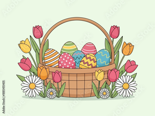 Fototapeta premium Easter Basket with Decorated Eggs and Spring Flowers.