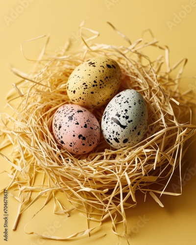 © Diffin, Obraz premium Easter basket with egg holiday background. Easter eggs beautiful colors