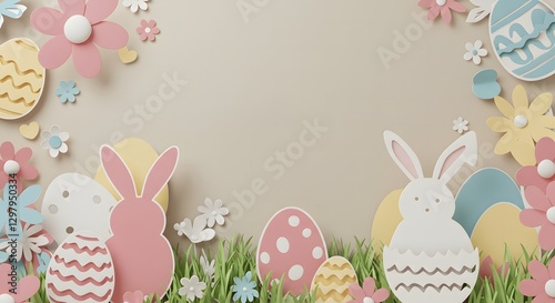 © OmRioRio, Obraz premium Easter Bliss: A 3D Celebration of Spring Generative AI. 3D poster captures the essence of Easter Day, featuring vibrant paper-cut elements that evoke a joyful atmosphere. Text space.