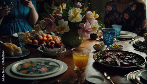 © Kaare, Naklejka premium "Easter Brunch Festivities" - a festive and colorful wallpaper background featuring an image of a delicious Easter brunch with floral accents and family togetherness, Generative AI