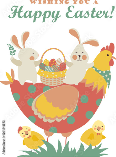 Obraz premium Easter bunnies,chicken and easter eggs. Vector illustration