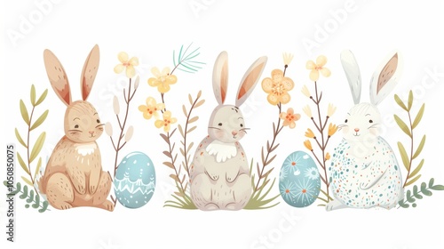 © Niphaphan, Obraz premium Easter bunnies with floral wreaths and painted eggs, vector on a white background