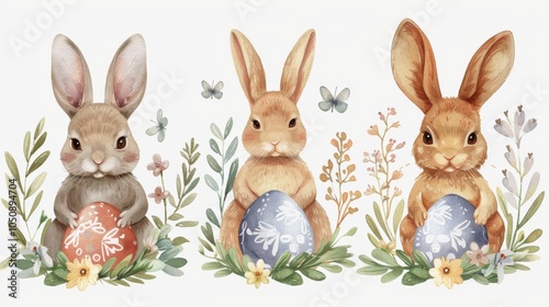 Obraz premium Easter bunnies with floral wreaths and painted eggs, vector on a white background