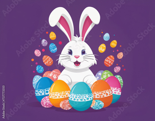 Fototapeta premium Easter bunny among large colored eggs. Holiday card for Easter