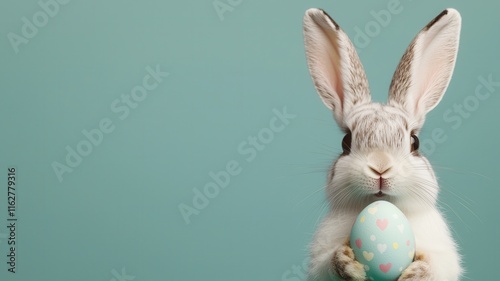 © Watcharaphon, Obraz premium Easter bunny and hope concept. Cute rabbit holding a pastel egg against a teal background.
