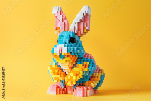 Naklejka premium Easter bunny built from plastic constructor bricks isolated on yellow background