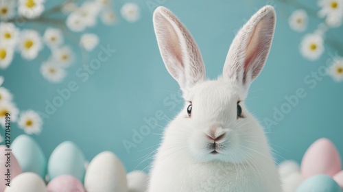 Obraz premium Easter bunny day concept. Adorable White Rabbit with Long Ears Surrounded by...
