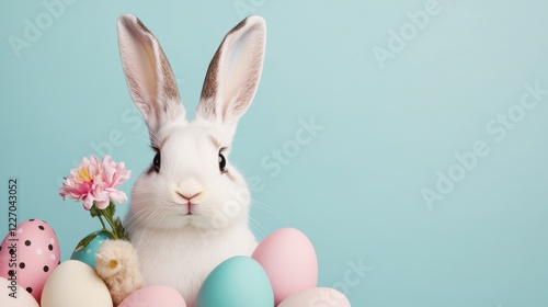 © JCreative, Obraz premium Easter bunny day concept. Elegant Easter Bunny Holding Flower in Paw on Pastel Background