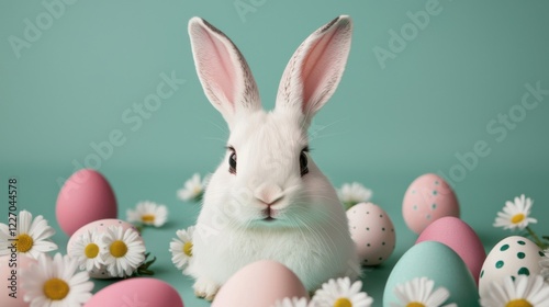© JCreative, Obraz premium Easter bunny day concept. Whimsical Easter Bunny in Pastel Meadow with Floral Decor