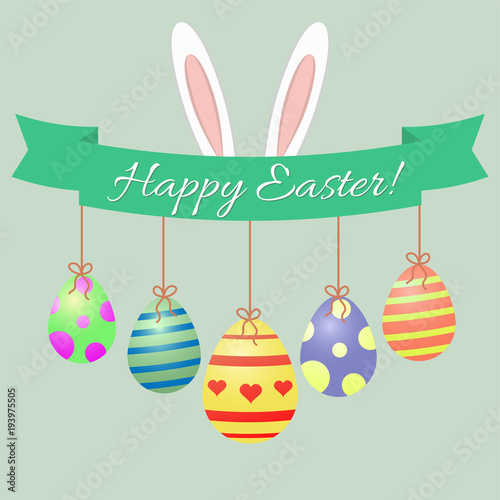 Naklejka premium Easter bunny ears, green ribbon and Easter eggs. Congratulations Happy Easter.