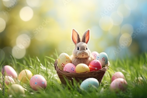 Fototapeta premium Easter bunny in green grass with painted eggs, sunny day, egg hunt, Happy...