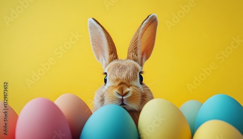 Fototapeta premium Easter bunny peeking from colorful eggs.