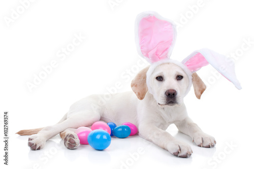 Fototapeta premium Easter bunny pet dog on Easter egg hunt