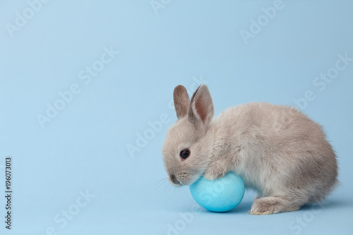 Fototapeta premium Easter bunny rabbit with blue painted egg on blue background. Easter holiday...