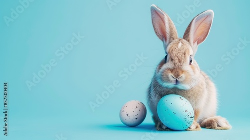 Fototapeta premium Easter bunny rabbit with blue painted egg on blue background. Easter holiday...