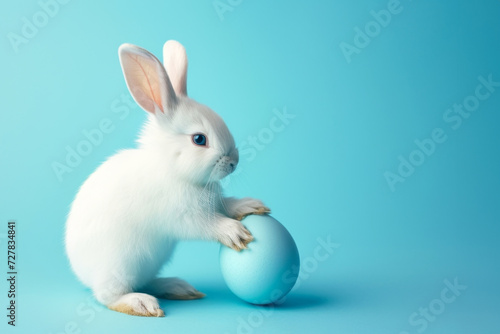 © Impressionstock, Fototapeta premium Easter bunny rabbit with blue painted egg on blue background. Easter holiday concept. copy space