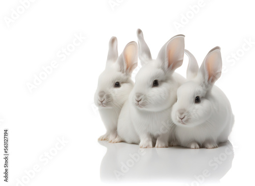 Obraz premium Easter Bunny Rabbits, three white cute fluffy dwarf bunnies sitting together on a white background. AI generative