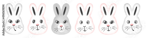 © Leyasw, Obraz premium Easter Bunny set. Cute rabbit face. Design elements. Cartoon collection isolated background