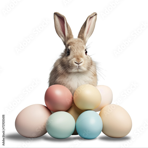 Fototapeta premium Easter bunny sits near painted eggs, transparent background