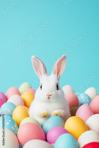 Fototapeta premium Easter bunny surrounded by colorful decorated Easter eggs, set against a...