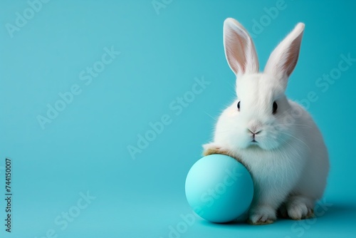 Obraz premium Easter bunny white rabbit with blue painted egg on blue background. Easter...