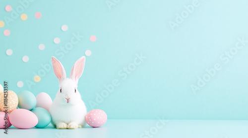 Obraz premium easter bunny with easter eggs - blue studio background.